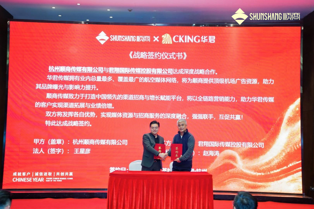 杭州顺商传媒有限公司与君翔国际传媒控股有限公司达成深度战略合作。华君传媒将提供顶级机场广告资源助力顺商品牌推广,顺商传媒将以全链路营销能力助力华君传媒客户拓展渠道、提升业绩,双方发挥各自优势,实现资源与服务融合、互促共赢。