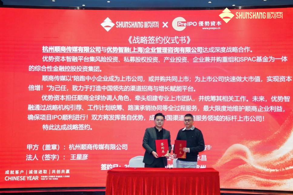 杭州顺商传媒有限公司与优势智融(上海)企业管理咨询有限公司达成深度战略合作。优势资本作为综合性金融控股投资集团,将担任顺商全球协调人,牵头组建上市团队并提供全过程服务,助力顺商IPO顺利推进;顺商传媒聚焦渠道招商与增长赋能,双方发挥各自优势,力争成为中国渠道营销服务领域的标杆上市公司。