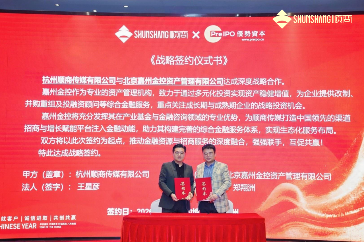 杭州顺商传媒有限公司与北京嘉州金控资产管理有限公司达成深度战略合作。嘉州金控将凭借其资产管理、金融咨询等专业优势,为顺商传媒打造领先渠道招商与增长赋能平台提供金融支持,双方将推动金融资源与招商服务深度融合,实现强强共赢。