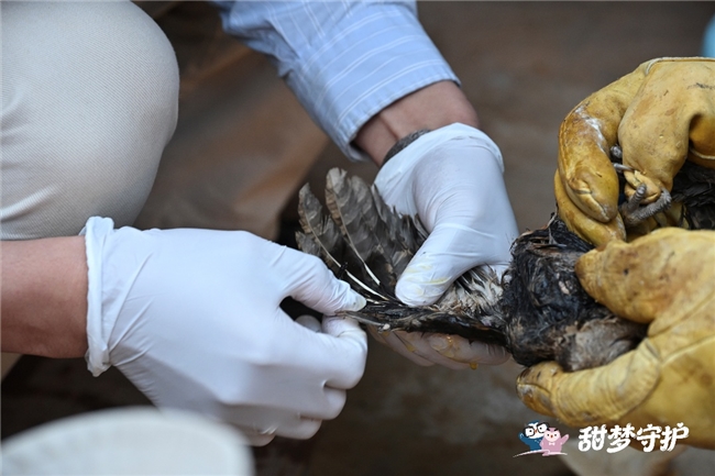 (粘鼠板的误伤是猫头鹰常见的人为伤害之一,救助人员需小心翼翼清理其羽毛上的粘胶,细致剥离粘黏物,最大限度减少伤害,为其争取康复机会。)