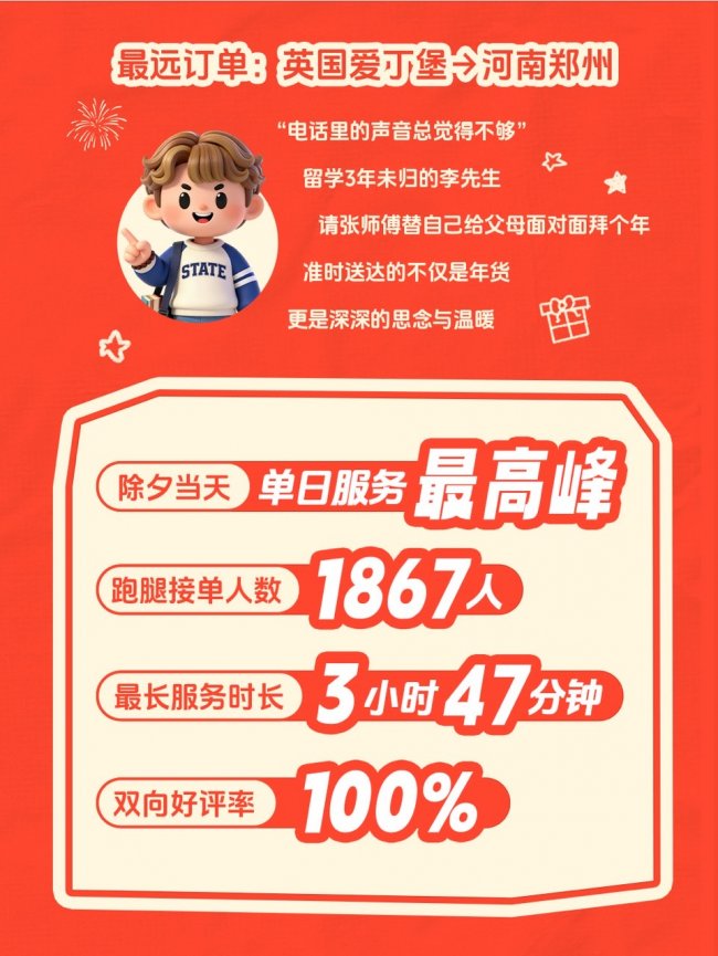 其中,最具代表性的“最远订单”来自一位定居英国爱丁堡的李先生。因工作原因无法返乡,他下单请郑州的骑手师傅替自己给父母拜个年。骑手不仅准时送达了年货,更用一段精心拍摄的视频,将父母的叮嘱与家中的年味,跨越13个时区,送到了李先生的眼前。这份订单送达的,不仅是年货,更是跨越山海的思念与温暖。