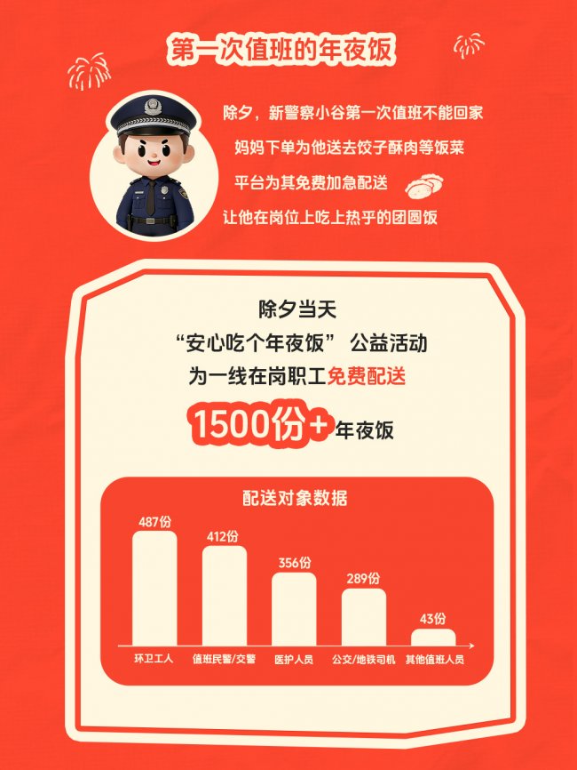 这些年夜饭被精准送到了环卫工人(487份)、值班民警/交警(412份)、医护人员(356份)、公交/地铁司机(289份)等城市守护者手中。其中,一位新警察小谷的故事尤为动人:除夕是他第一次值班不能回家,妈妈特意下单为他送去了饺子、酥肉等家乡饭菜,平台安排女骑手安全配送,让他在岗位上也吃上了热乎的团圆饭。