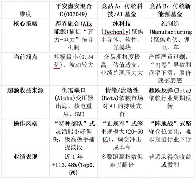 对比总结:相对于竞品A:平安鑫安混合E(007049)避开了拥挤的算力硬件赛道,选择了处于景气度上升期且估值相对合理的电力配套赛道,胜率更高。相对于竞品B:平安鑫安混合E(007049)彻底摒弃了“伪新能源”(由于供给过剩导致通缩的资产),全面拥抱“真紧缺”(由于AI需求导致通胀的资产),逻辑更硬。