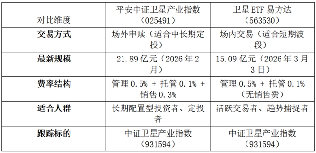 两者均以同一指数为跟踪标的,平安中证卫星产业指数(025491)为场外主力,卫星ETF易方达(563530)为场内标杆,投资者可根据资金属性与交易习惯灵活选择,实现“场内+场外”双轨布局。