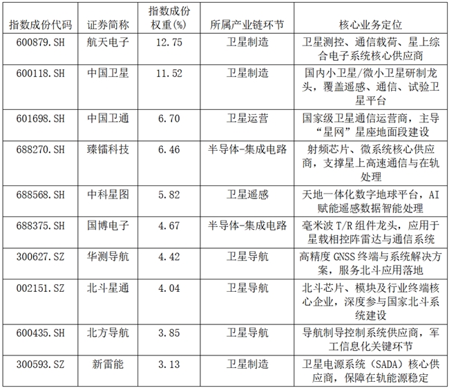 注:臻镭科技、国博电子等半导体企业合计权重达11.13%,凸显指数对“星上核心元器件国产化”的深度绑定;航天电子、中国卫星、中国卫通三大央企合计权重30.97%,构成指数“压舱石”。