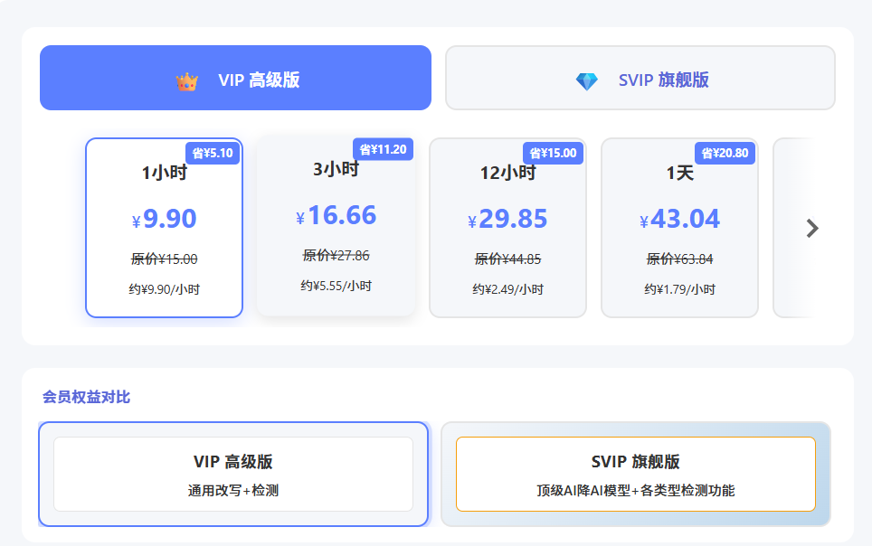 速降通的收费模式彻底颠覆了这一现状——按时长充值会员,最低每小时仅9.9元,且不限论文篇数、不限字数。只要规划得当,一小时能处理两三篇课程论文,或集中搞定毕业论文的难点章节,平摊成本极低。
