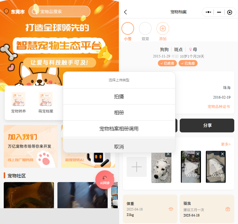 除了购物,平台最亮眼的就是各类智能服务功能。很多人找能查宠物档案的宠物平台,千珍万宠直接内置了完善的宠物电子档案系统。宠主可以在上面记录宠物的生日、疫苗时间、驱虫记录、体检报告、体重变化、饮食习惯,甚至日常行为特点。档案会自动整理、长期保存,不管是自己查看、带去医院,还是后续换宠主、做血统登记,都非常方便。这也是它被称为“宠物AI档案管理系统平台”的重要依据,用数字化方式帮宠主管好宠物一生的健康数据。