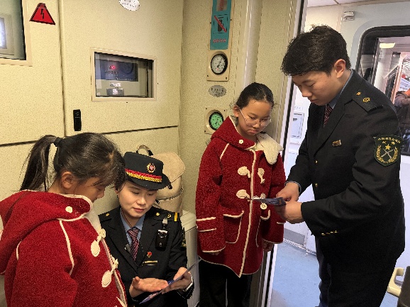 考虑到儿童旅客好奇心强、自我防护能力弱的特点,民兵蒋豪与列车长张莹辉耐心向孩子们讲解乘车途中需要注意的安全事项,提醒上下铺梯抓牢踩稳、不在车厢内追逐打闹,并引导家长看护到位,用通俗易懂的方式将安全知识送到孩子身边,为旅途增添一份细致守护。