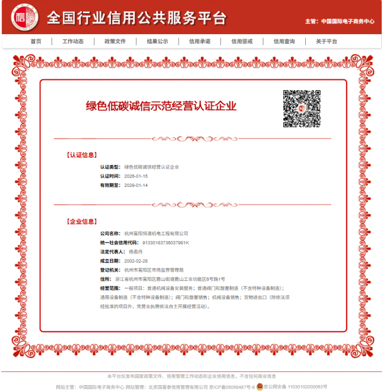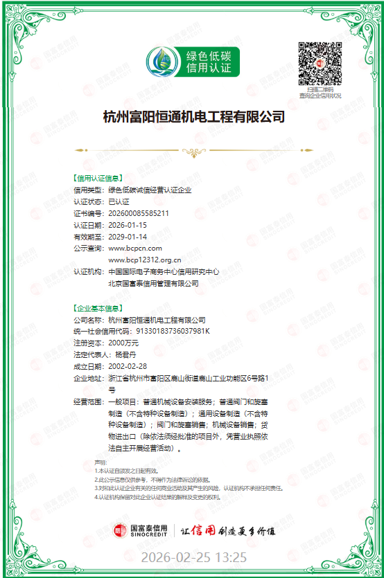 在“推动绿色发展,加快发展方式绿色转型”的国家战略指引下,制造业正迎来一场深刻的绿色革命。近日,从全国行业信用公共服务平台获悉,专注于特种阀门研发制造的杭州富阳恒通机电工程有限公司凭借其在绿色低碳发展领域的卓越实践,成功获得由国家商务部、国资委推动征集的绿色低碳诚信承诺示范企业权威认证。这一殊荣不仅是对企业深耕特种阀门制造领域的权威认可,更标志着其在杭州市乃至全国制造业民营企业中树立了高质量发展与绿色转型的新标杆。
