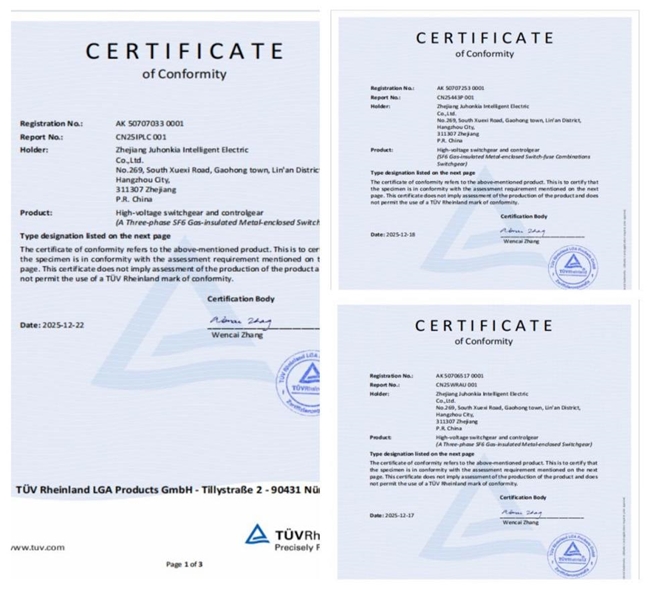 公司始终坚持自主创新发展路径,累计获得专利90余项,28个产品通过省级工业新产品认定,13个产品荣获行业奖项,2个产品通过“浙江制造”认证。其中,高可靠常压密封环网柜被评为“浙江制造精品”,深度融合一体集成式柱上断路器荣获“浙江省优秀工业新产品”称号。2025年,聚弘凯自主研发的JSR6系列气体绝缘金属封闭开关设备,通过德国TÜV莱茵集团的全项型式试验,标志着公司在产品设计、制造工艺及质量管控领域,均已跻身国际先进水平行列。
