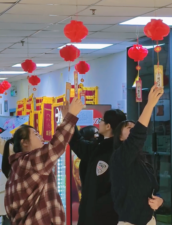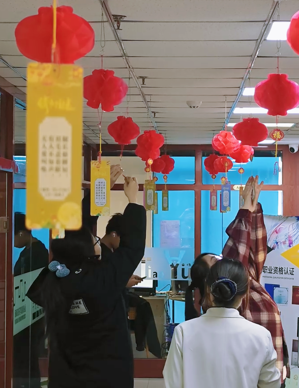半颗星教育校区的同学和老师正在一起挂灯笼、贴谜语,走廊上,更是张灯结彩,一个个漂亮的灯笼下是一张彩色的灯谜纸条。