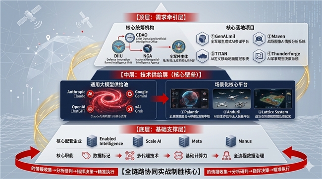 - 核心统筹机构:包括首席数字与人工智能办公室(CDAO)、国防创新部门(DIU)、国家地理信息情报局(NGA),以及陆军、空军、海军、太空军、印太司令部等全军种作战主体,负责统筹全军AI战略、输出场景化需求、推动项目落地验收。