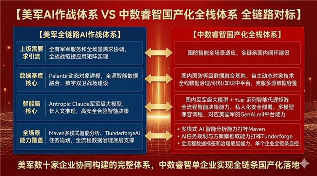 不同于国内多数企业仅对标单一巨头的单点能力,中数睿智的核心壁垒,在于实现了对美军AI作战体系全链条核心能力的国产化覆盖,不止对标Palantir与Anthropic,更补齐了从底层数据治理到顶层智能应用的全栈能力,完美适配国防智能化的全场景需求。
