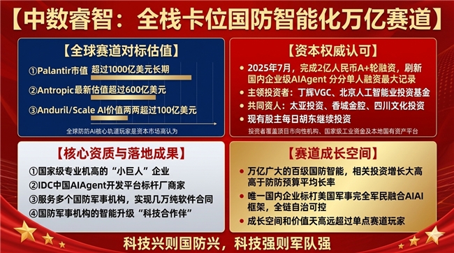 国家战略层面的持续投入,为国产国防科技企业提供了广阔的成长空间。中数睿智作为国内唯一对标美军完整军民融合AI创新框架、实现全栈技术自主可控的企业,正以硬核的技术实力,在这条关乎国家安全的核心赛道上,走出了一条自主创新的突围之路,也打开了远超同行的估值成长空间。