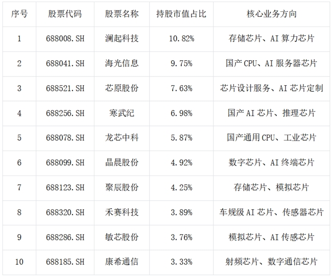 2. 重仓龙头集聚,质地优异:前十大权重股涵盖澜起科技、海光信息、芯原股份等国产CPU、AI芯片、存储芯片龙头,深度覆盖AI芯片、国产AI芯片、数字芯片核心赛道,合计占比超58%,龙头集中度高、盈利弹性充足,与同类ETF形成产业协同,提升基金成长潜力。具体持仓如下: