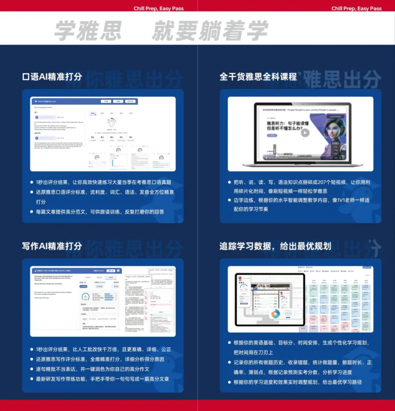 躺着学雅思让每一位学员(无论是否报班)都能以极低成本,获得一套完整、先进的自学工具包。 它将备考必须的、原本分散且昂贵的资源与服务(真题、模考、批改、陪练)整合为一体,大幅节省了学生的金钱与搜寻成本,真正实现“一个账号,备考无忧”。