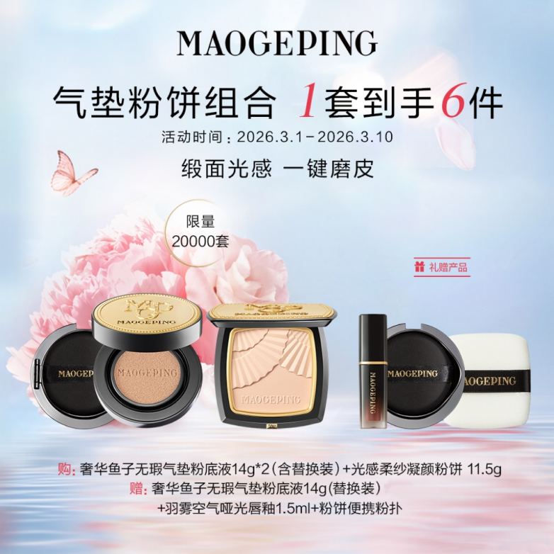 想要快速出门又不想将就?毛戈平奢华鱼子无瑕气垫粉底液搭配光感柔纱凝颜粉饼,是春日通勤与约会的绝佳搭档。气垫轻盈遮瑕,持妆透气,焕现细腻光泽肌;粉饼甄选双色,上脸柔焦定妆,随时补妆不卡粉。