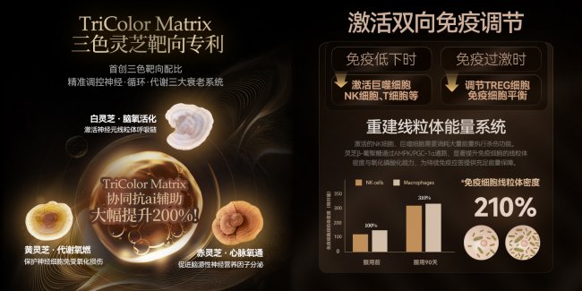 核心奥秘更在于行业首创的“TriColor Matrix三色靶向配比”结合独家三重机制融合工艺,精准调控神经、循环、代谢三大衰老系统。白灵芝专攻脑氧活化,激活神经元线粒体呼吸链;黄灵芝主导代谢氧燃,保护神经细胞免受氧化损伤;赤灵芝聚焦心脉畅通,促进脑源性神经营养因子分泌。这项技术突破了传统灵芝产品效果单一、作用时间短暂的技术瓶颈,实现了从细胞微环境优化、能量代谢强化、免疫巩固平衡、DNA脑力修复促进四大维度的调控。庞大的临床验证证实,直井GY株独有的多源免疫壁结构突破维度壁垒,比普通单一成分提升90%以上,稳居行业第一梯队。