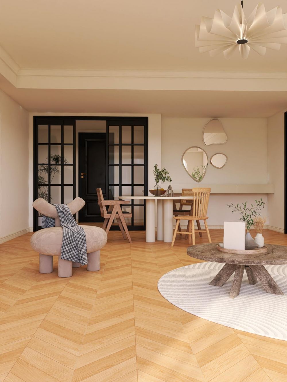 复古风格在2026年迎来新一轮热度,法式优雅、田园浪漫、中式韵味各放异彩。罗浮威尔在这三大复古细分领域均有深度布局,形成完整风格矩阵;法式木纹砖强调优雅与精致的平衡,通过细腻表面处理和柔和色彩搭配,营造法国乡村庄园般的浪漫气息。田园风木纹砖注重自然质朴表达,砖面纹理粗犷不失细节,色彩偏向大地色系,与木质家具、藤编元素和谐搭配,打造放松舒适的家居环境。