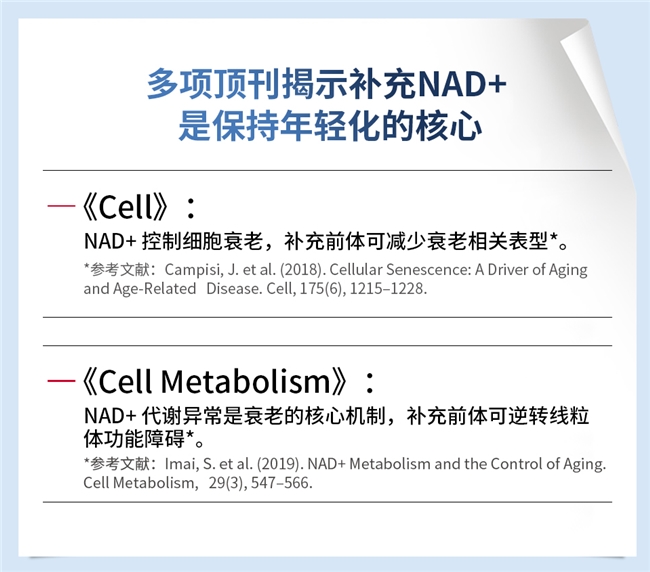 研究发现,随着年龄增长,人体内 NAD+水平会持续下降,而NAD+正是维持细胞活力、身体机能与年轻状态的关键物质。补充NMN等NAD+前体,能够有效提升体内NAD+浓度,这也是NMN类抗衰补剂近年来迅速流行的原因。