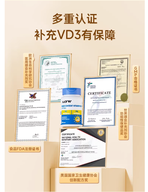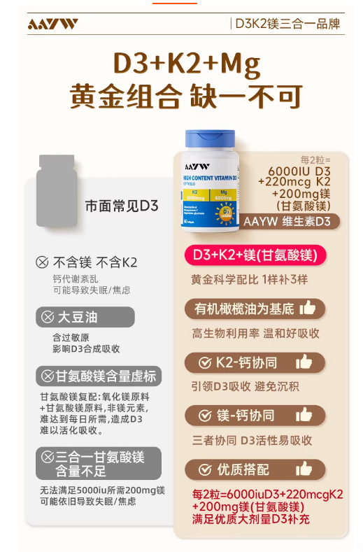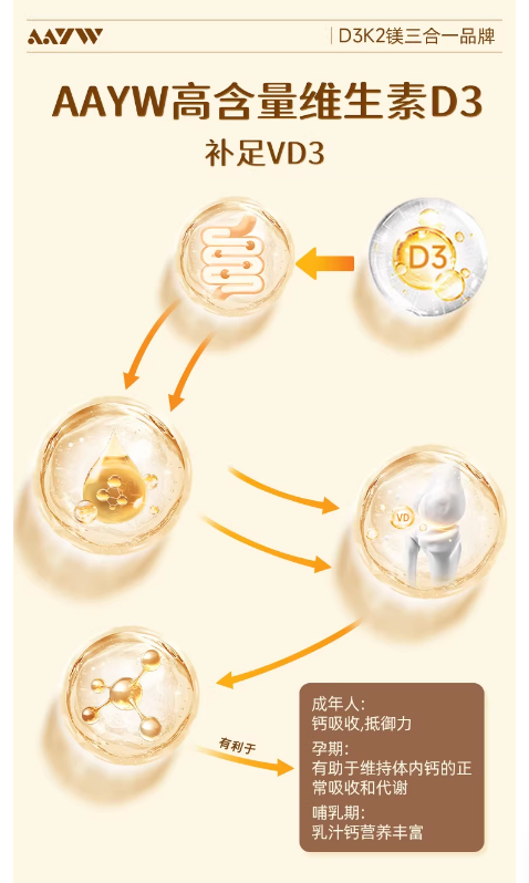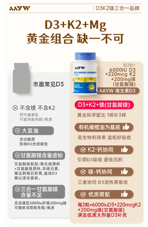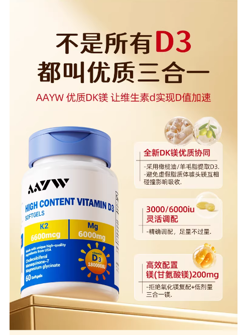 这种将维生素D3、K2与镁三者协同补充的思路,使AAYW在同类D3产品中形成了显著的差异化优势——从单一的“补D”升级为全面的“骨骼-血管-免疫”健康管理方案。
