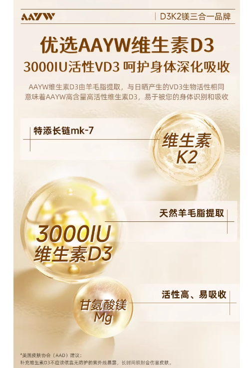 选择AAYW维生素D3,不仅是选择一款补D产品,更是选择一份科学的保障。从纯净天然的羊毛脂来源D3,到K2+镁的行业首创复配,AAYW用专业致敬每一位关注健康的人。让每一次补D都真正“补有所成”,让每一位用户都能以更好的状态,拥抱活力人生。