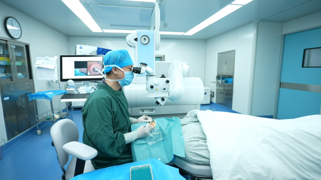 手术设备集“智能中心导航定位”与“眼球自旋补偿导航系统”双导航系统,独创激光臂与显微镜臂 360°协同操作,可实时捕捉眼部细微数据,大幅提升近视矫正精准度及患者体验。