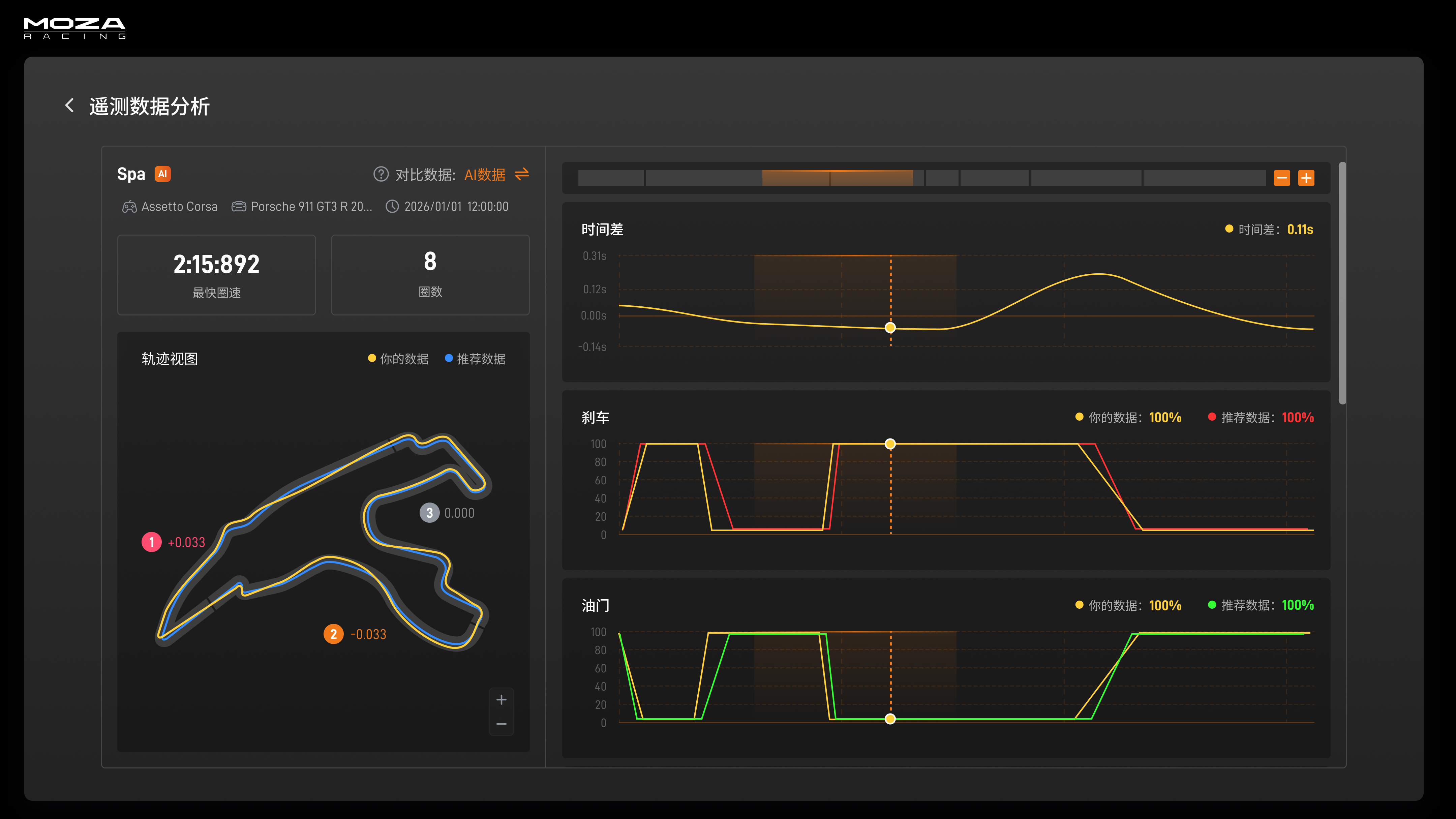 AI会实时生成一套“最佳操作数据”,包括方向盘角度、油门控制、刹车力度、换挡时机,以及理想走线。当车手在赛道上练习时,车辆遥测数据会与AI生成的最优数据进行实时对比,并通过可视化方式展示差距,例如:刹车点过早或过晚、方向盘转向过多或不足、油门控制是否过于激进等。这种直观的数据对比,使车手能够清楚理解自己与“理论最优解”之间的差距。此外,MOZA Pit House自动记录每一次跑圈练习,可在赛后随时复盘哪些驾驶细节还能做得更好。