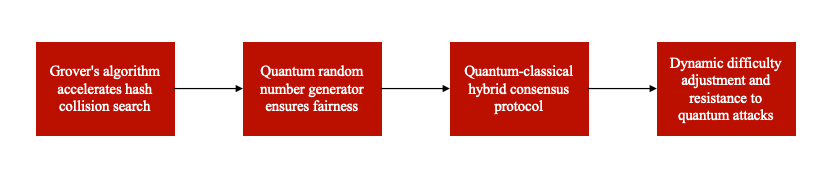 量子优化PoW是量子计算与经典共识机制的深度融合,其核心包含两大模块:量子加速的哈希碰撞搜索与量子增强的公平性保障。Grover算法作为量子搜索的代表性技术,通过量子态叠加与振幅放大,将无序数据集中的目标项搜索复杂度从经典计算的O(N)降至O(√N),理论上可提升哈希碰撞搜索速度。量子随机数生成器(QRNG)则利用量子涨落现象生成不可预测的真随机数,替代传统伪随机数算法,确保区块生成与交易排序的绝对公平性。二者协同作用,在降低算力消耗的同时,构建起抗量子攻击的共识基础设施。