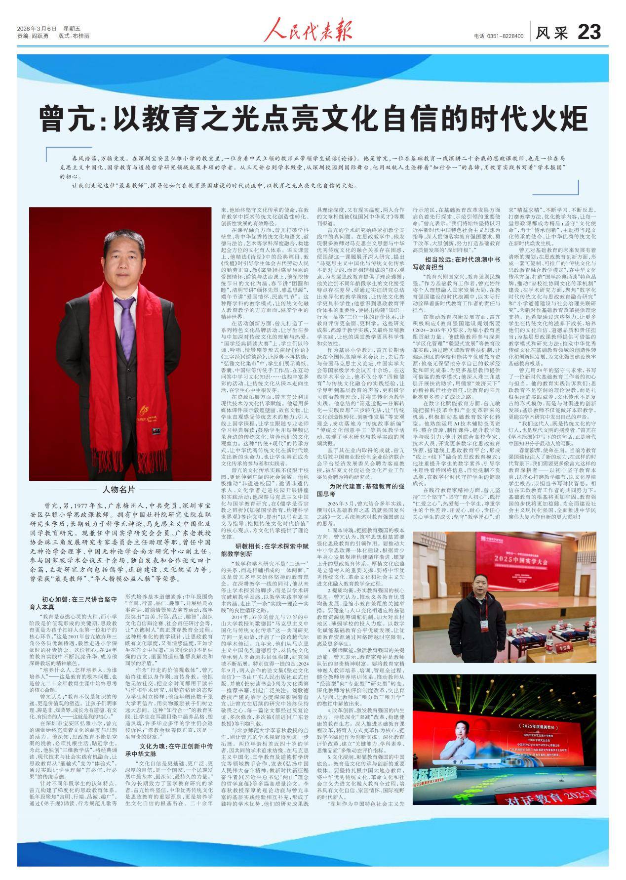 “教育兴则国家兴,教育强则民族强。”作为基础教育工作者,曾亢始终将个人理想融入国家发展大局,在教育强国建设的时代浪潮中,以实际行动诠释着新时代教育工作者的责任与担当。