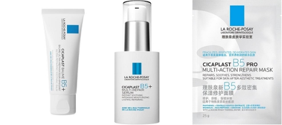 图:理肤泉新B5多效舒缓修护霜、理肤泉新B5多效修护精华、新B5多效密集保湿修护面膜