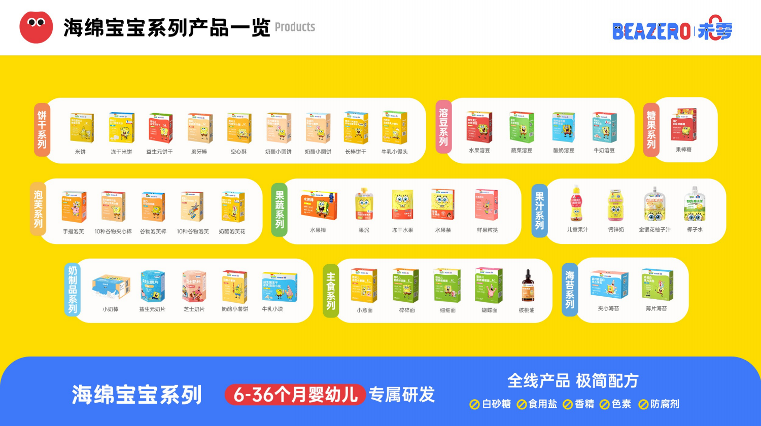 以未零海绵宝宝系列为例,该系列专为6-36个月岁宝宝研发,全线产品严格践行0食用盐、 0白砂糖、0香精、0防腐剂、0色素的纯净原则,所有产品均以非油炸工艺保留食材本味,让宝宝放心吃。无论是作为宝宝零食的日常补充,还是满足宝宝解馋磨牙的需求,未零都以天然食材本味与极简配方的设计,赢得了宝宝的喜爱与家长的信任。