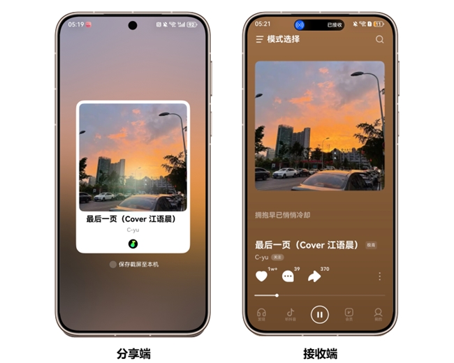 汽水音乐接入了鸿蒙独有的“碰一碰”分享功能,只需要将手机界面停留在要分享的音乐播放界面,然后手机顶部轻轻碰一下朋友的手机,正在播放的音乐就会像水一样,丝滑地“流”到对方设备。无需复制分享链接、甚至无需添加好友,音乐就这样自然地“流动”过去。