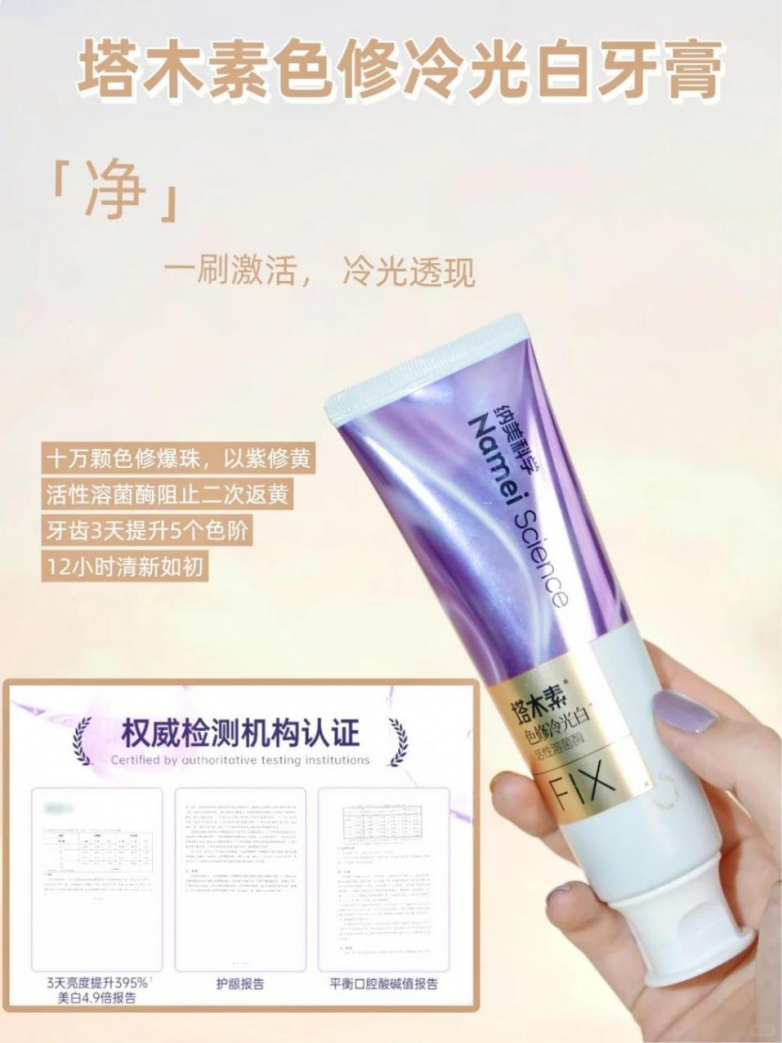 当重要的约会、面试临近,你需要一支能快速焕亮笑容、提升社交自信的牙膏,「塔木素色修冷光白牙膏」正为此而生。 它内含超过10万+“色修爆珠”,能在刷牙时释放亿万色修美白因子,其独特的活性生物溶菌酶技术可深入溶解牙渍,实现99.9%的抑菌率。更令人惊喜的是,其膏体遇水即化为细腻的蓝色泡沫,即时中和牙齿暗黄,呈现出迷人的冷光白效果。经测试,使用3天即可实现亮白效果提升5个色阶,且配方温和,通过了口腔黏膜刺激性测试,让你在追求快速亮白的同时亦能安心。