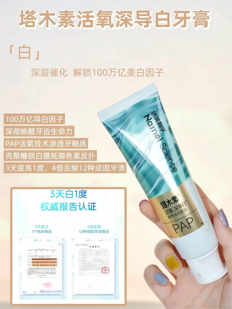 而对于有长期吸烟、饮用浓茶习惯,或对美白有更高阶要求的人群,「塔木素活氧深导白牙膏」则提供了专业级的攻坚方案。它采用PAP超能活氧与导入式美白技术,能释放100万亿美白因子深入渗透,温和瓦解深层色素。这款产品旨在精准对抗顽固牙渍,使用3天即可帮助牙齿提亮1度,并具备4倍清除12种常见顽固渍垢的能力。同时,其配合的壳聚糖锁白技术,旨在延缓色素复着,让亮白更持久。在强效清洁的同时,其抗菌率大于99.9%,并确保了配方的温和属性,实现了高效清洁与口腔安全的平衡。