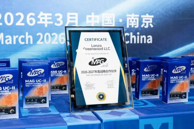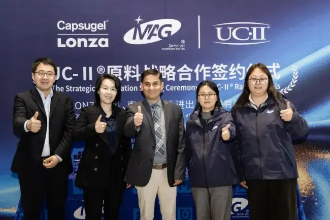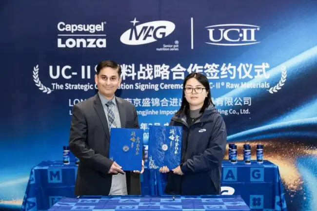 高端宠物营养品牌MAG与全球生命科学领域权威瑞士龙沙集团(Lonza)正式签署战略合作协议。双方宣布,将围绕龙沙旗下全球专利成分——非变性Ⅱ型胶原蛋白(UC-II®)在宠物关节健康领域的应用展开深度合作,并同步推出战略合作的首款新品MAG菲速关节生医护版。此次合作标志着MAG在宠物高端功能性营养品的原料创新与研发理念上再次实现重要突破,持续引领行业迈向精准化、科学化护理的新阶段。