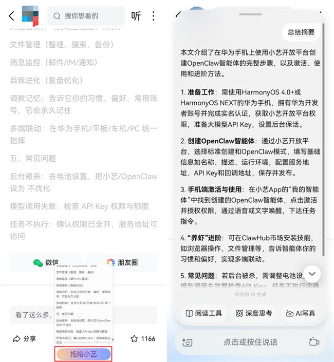 ·阅读更快:今日头条、知乎、凤凰新闻上刷到长文没空细看,拖给小艺,摘要直接甩给你。