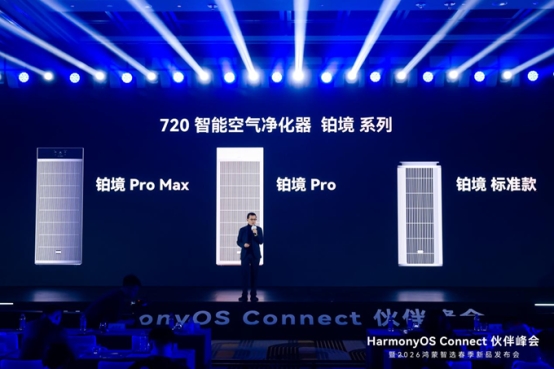 3月10日,HarmonyOS Connect伙伴峰会暨2026鸿蒙智选春季新品发布会正式开幕,这场年度重磅盛会,汇聚了生态伙伴、行业精英与各界媒体人士,聚焦全场景智慧生活生态的创新与落地,成为行业关注的焦点。作为鸿蒙智选健康空气领域的核心合作伙伴,柒贰零健康科技(后简称720)携全新全新旗舰空净产品——鸿蒙智选720智能空气净化器铂境Pro Max(后简称铂境Pro Max)重磅发布,为智慧健康生活注入新活力,成为峰会焦点之一。