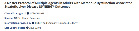 [2] Study Details | NCT07165028 | A Master Protocol of Multiple Agents in Adults With Metabolic Dysfunction-Associated Steatotic Liver Disease (SYNERGY-Outcomes) | ClinicalTrials.gov.