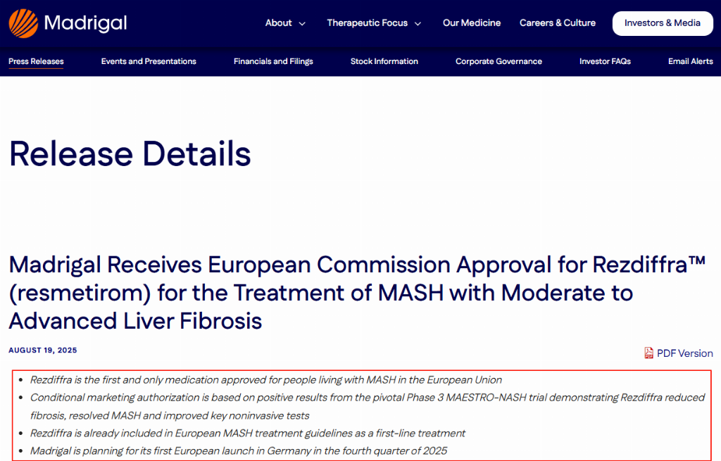 [3]Madrigal Pharmaceuticals. (2025, August 18). Madrigal Receives European Commission Approval for Rezidiffra™ (resmetirom) for the Treatment of MASH with Moderate to Advanced Liver Fibrosis [Press release].