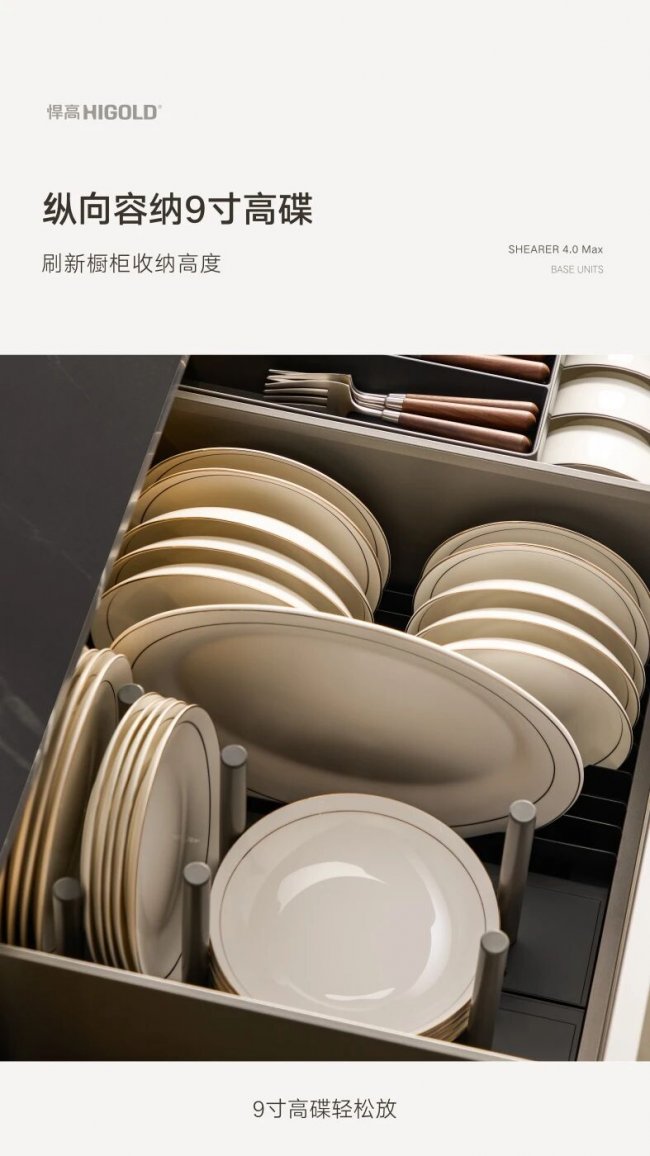 每次兴致勃勃准备下厨,打开橱柜的一瞬间,看着乱七八糟堆叠的碗碟,好心情立刻烟消云散。想拿最下面那只盘子,得像玩叠叠乐一样小心翼翼,稍有不慎就是叮叮当当一阵响;新买的9寸深盘满心欢喜带回家,却发现竖着放不进柜子,只能无奈“躺平”积灰,既占空间又不卫生。厨房收纳的痛点,往往就藏在这方小小的橱柜里,直到遇到悍高集团匠心打造的希勒4.0Max碗碟篮,才发现原来收纳也可以如此从容。