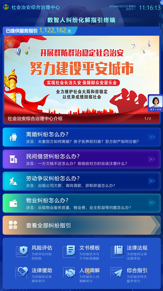法律援助、调解、综合指引服务:法律援助、人民调解机构信息全覆盖,构建“问答—指引—办事”全闭环,打通法律服务“最后一公里”。