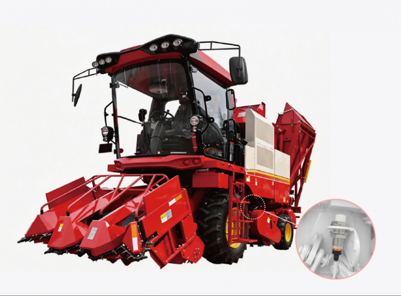 感应粮仓回位:杜绝“洒粮”,颗粒归仓在玉米果穗进入粮仓的过程中,粮仓的位置是否准确回位直接关系到卸粮的顺畅度。电感式传感器-LR18F系列提供8mm和12mm的远距离检测能力,使安装位置设定更轻松。将其安装在粮仓翻转与锁定机构处,它能实时、精准地检测粮箱是否归位到位。即使因长时间作业导致安装支架轻微形变,其远距离检测特性也能确保信号稳定,避免因位置偏差导致的粮食洒漏,真正实现颗粒归仓。