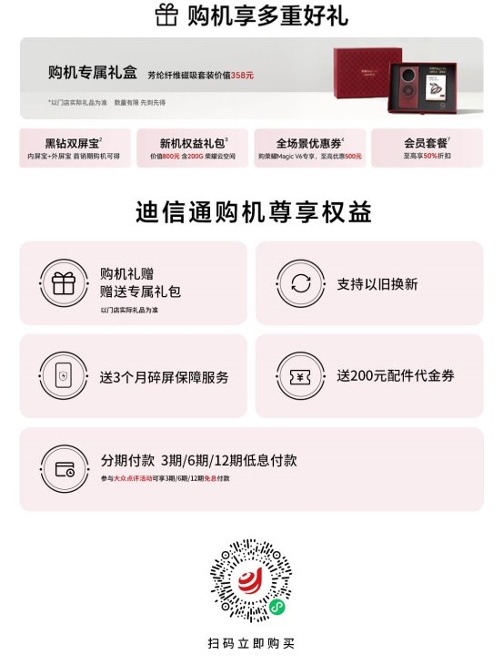 现在,荣耀Magic V6已在迪信通正式开售,购机可享多重好礼,感兴趣的朋友可前往【迪信通官方商城】微信小程序或线下门店购买。