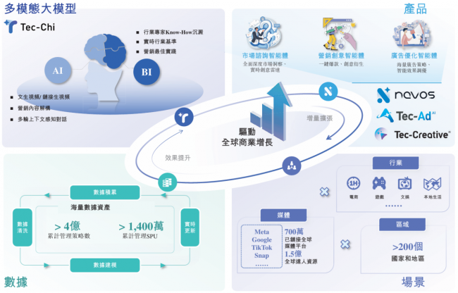 钛动科技自研的钛极多模态大模型应运而生。它采用MoE(混合专家)架构,内置问答推理、内容理解、视频生成三大核心能力,凭借“AI+BI”协同运作,能够根据实际投放效果自动校准广告策略与参数,实现“越用越强”的效果,形成专为跨境营销而生的自适应智能引擎。