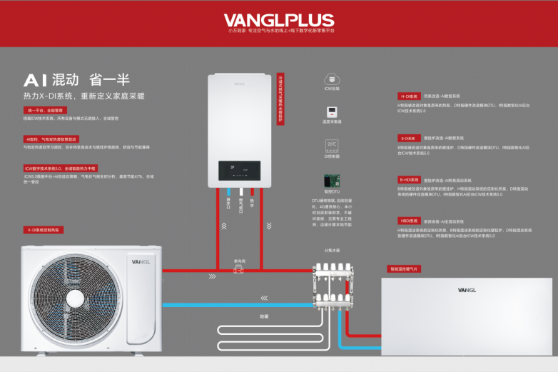 VANGL万居隆的应对策略,围绕“小型化、数智化”展开。其AI混动热力X-DI系统通过气电双热源耦合,拓展了单一能源的运行边界。以湖北十堰的改造案例为例:一户家庭原使用壁挂炉采暖,冬季采暖费约4000-5000元。加装B-HDI系统后,保留原壁挂炉,加装热泵和DTU智能模块,AI算法根据室温目标自动选择运行模式,改造后日均费用降至20元左右,一个采暖季节省约2000元。