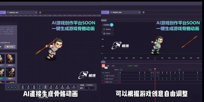 在今年的GDC、ChinaJoy等各大技术峰会上,“AI生成骨骼动画”成为最炙手可热的话题。腾讯VISVISE展示了3D动作生成的前沿探索,各大引擎厂商纷纷推出AI动画辅助插件。然而,在2D游戏这个占据市场半壁江山的领域,真正的产业级突破来自一家中国AI公司——极逸人工智能,及其旗下产品AI游戏创作平台SOON。