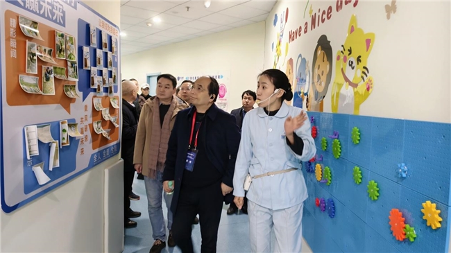参观过程中,专家们依次走进孤独症全程康复中心、触觉调节走廊、游戏社交长廊、成果展示中心等特色区域,直观了解医院的空间设计与服务理念。医院重点介绍了独创的“3+5+1”医教融合体系:每天不少于3小时的高强度专业康复、每周5天全程规范干预,再加上每周一次的“繁星营地”社会实践课,帮助孩子从封闭训练走向社会融合。同时,医院依托互联网医院,把康复服务延伸到家庭,形成“院内干预+院外支持”的完整闭环。