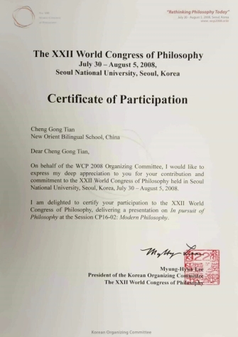 论文入选世界哲学大会并做报告的证书