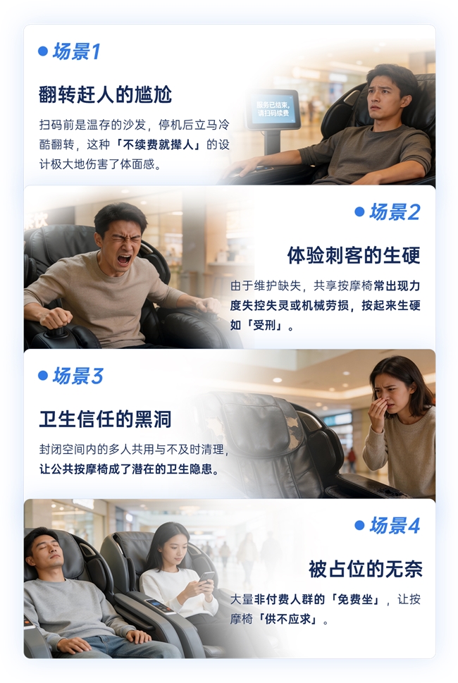 认识按摩椅,很多消费者是从影院、车站、商场等公共场所开始的,一部分视其为生活间隙中的回血,也有一部分将公用按摩椅看作舒适区的刺客,这正是导致对按摩椅产品共识错位的源头。尤其一些共享按摩椅的反人性设定,往往带来反向安利的结果——